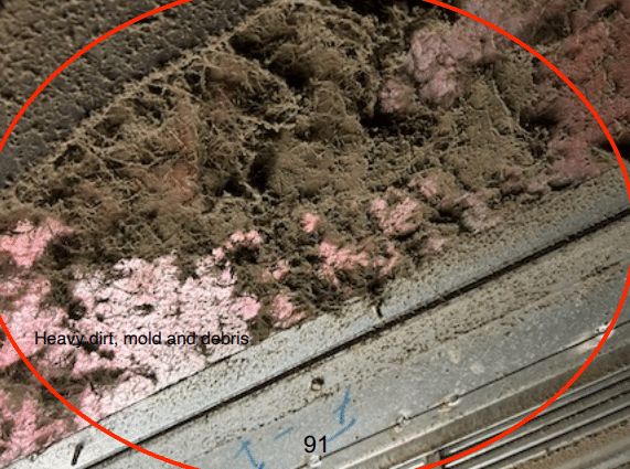 The report says, “When these units were installed, the insulation (which is porous) was placed on the inside of the duct work. If this interior insulation picks up too much moisture and debris, mold will start growing inside of the ductwork into the insulation. Over the years, the debris has passed through the ductwork and deposited a lot of this organic material and embedded it into the insulation.”