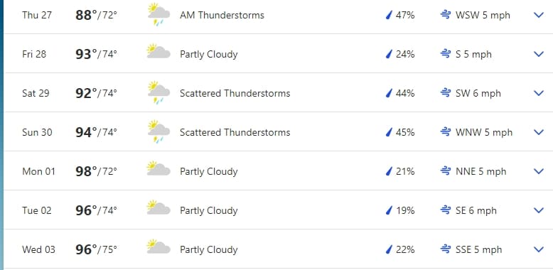Sunny to partly cloudy. A stray shower or thunderstorm is possible. High 98F. Winds WSW at 5 to 10 mph.