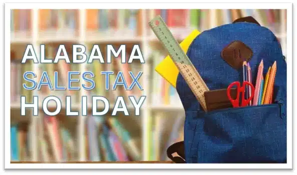 The Elmore County Commission is pleased to announce continued participation in the Annual Back-to-School Sales Tax Holiday beginning Friday, July 19, 2024 at 12:01am (CST) ending at midnight on Sunday, July 21, 2024. On April 27, 2017, the Commission approved a Resolution authorizing participation in the Sales Tax Holiday (authorized by Act No. 2017-120) and each year after beginning at 12:01am on the third Friday in July and ending at twelve midnight on the third Sunday in July.