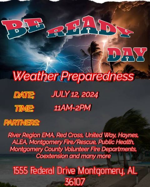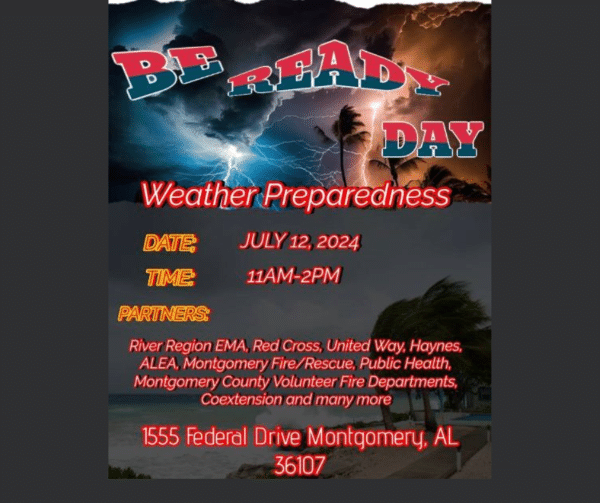 Tri-County Be Ready Day for Elmore, Autauga, and Montgomery Counties. July 12, 11AM – 2PM at 1555 Federal Drive in Montgomery. Bring the family, church members, and friends to learn more about being prepared for before, during, and after disasters in your area.