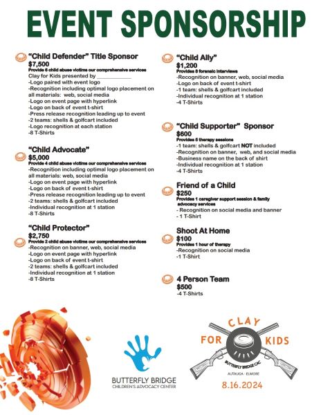 Hutcheson stated the money raised will go directly back to the offices within Elmore and Autauga Counties. Different sponsorships are available and can be found on their website at, https://clay4kids.swell.gives.