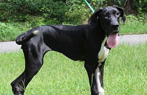 Grace is a 6-month-old female Great Dane who has been spayed. She is an owner turn in because her owner lost her home. Grace is black with white markings; and she is a nice-looking dog. However, we had a hard time getting a decent picture of her. She was so excited to be outside and enjoying all the attention that we couldn’t get her to stand still for long! It was also a hot day and you can see Grace has a extra-large tongue–one a Dane would be proud of! She weighs only 41 pounds, and she is underweight. Our staff is working on getting the proper nutrition to help her gain weighs. Grace is just a super-sized goofy girl who is all puppy! Grace would be good with other dogs and older children (due to her activity level and size). She is a wild and crazy girl but is trying to learn to be a good girl on a leash. Special needs has been indicated on her bio because she has a condition known as ‘knuckling’ on her front legs. The vet is taking a look at her; and the staff should be able to fill you in on this if you are interested in adopting Grace. ‘Knuckling’ is a common condition with young Danes due to their rapid growth. If you are interested in adopting Grace–please let us know. She has so much to offer and we just love her great big personality and goofiness!