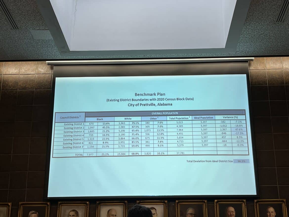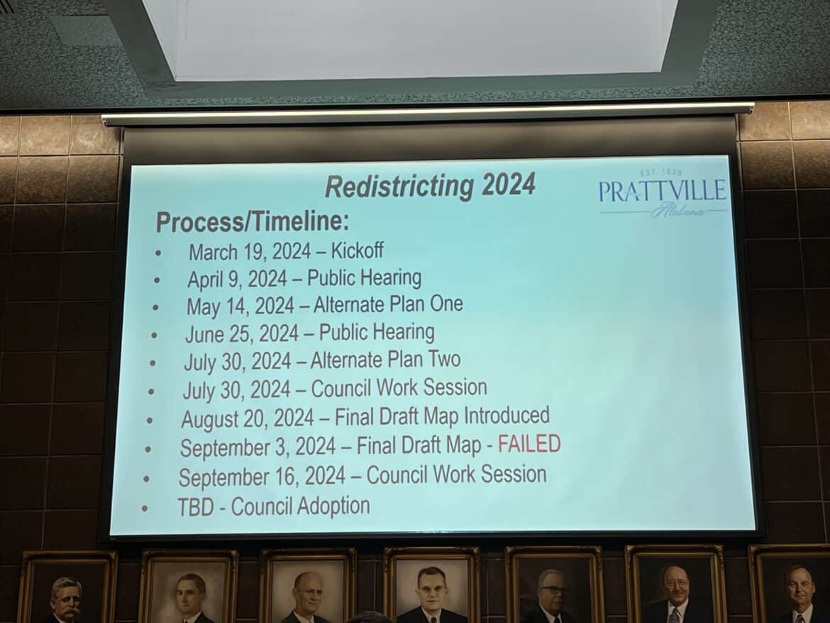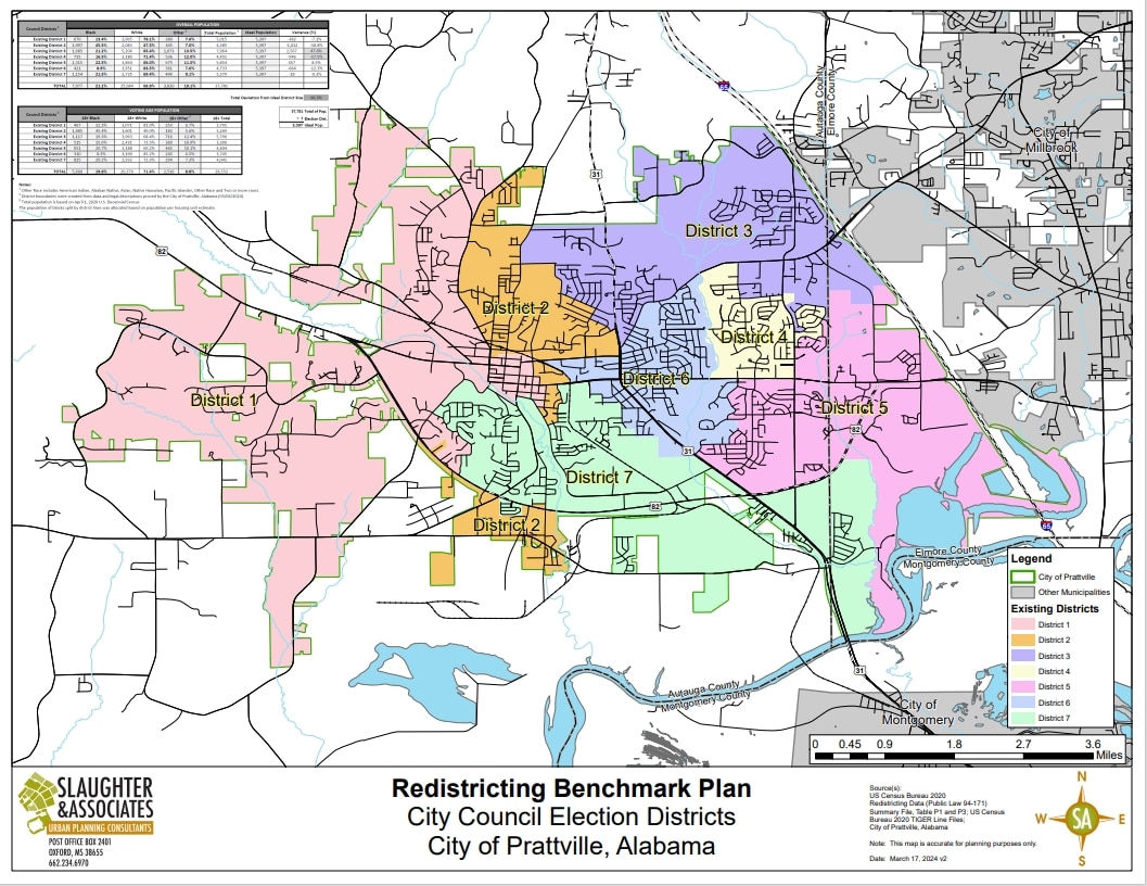 Currently there’s a benchmark plan in place with Slaughter and Willingham Associates Planning Firm for the new city council districts, using the 2020 census block numbers, input from the council members and the community that have either given input or sent in their own district maps. The Benchmark plan is publicly available online and can be found on the City of Prattville website or by clicking https://prattvilleal.gov/redistricting-2024/.
