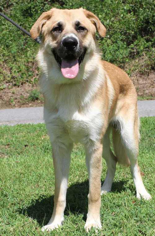 We like BIG mutts and we can not lie! Dexter Ford is a 7-month-old male Saint Bernard/Shepherd mix who will be neutered before adoption. He is an owner turn in because his elderly owner could no longer take care of him. Dexter Ford is magnificent! His medium length coat is tan with white markings. Dexter is a very large young dog at just 7 months–80 pounds. He will weigh at least 100 pounds as an adult. He is somewhat housetrained but does have accidents in the house. Dexter is strong but sweet and gentle. He is working on leash training but he is a “puller” when leash walking. Dexter needs an owner who is willing to take up a lot of time with him; and understands he is a giant of a dog–and still a puppy at heart.