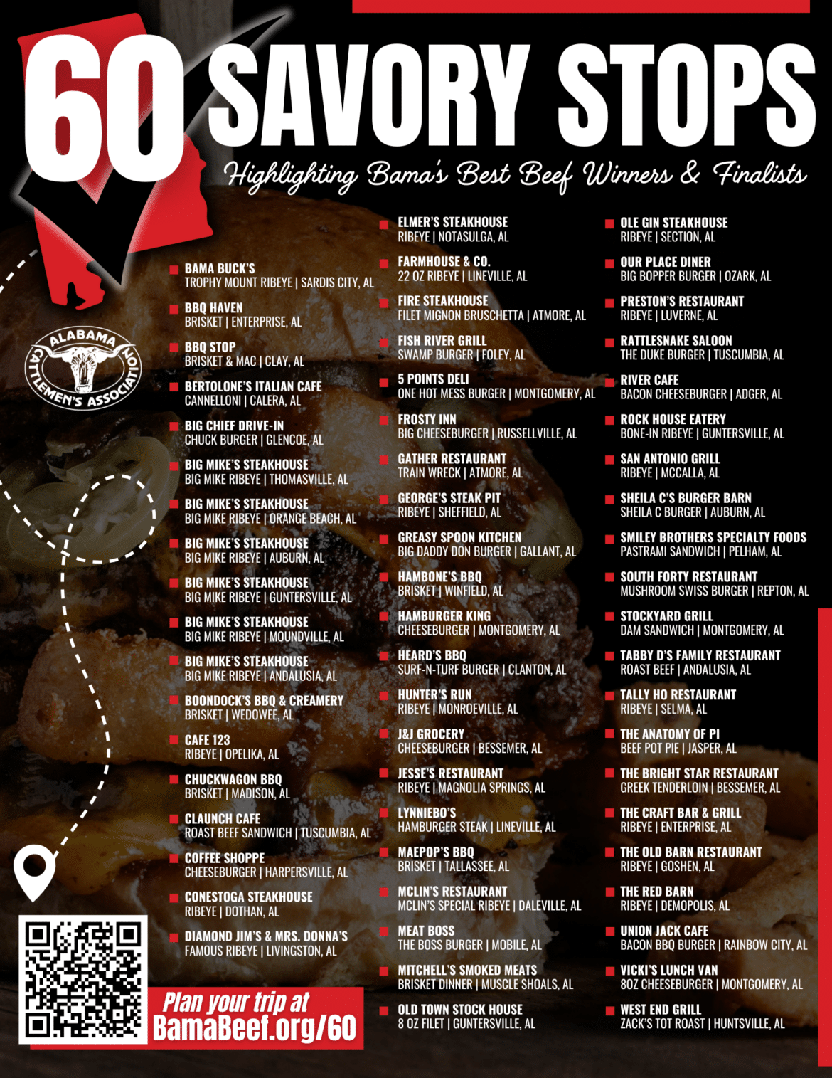 MONTGOMERY, AL— In celebration of the 60th consecutive year of October Beef Month in Alabama, the Alabama Cattlemen’s Association (ACA) has unveiled a promotion titled “60 Savory Stops.” This promotion highlights 60 former restaurant winners and finalists of the Alabama’s Best Steak, Bama’s Best Beef and Bama’s Best Burgers contests, which have been hosted by the ACA for more than a decade.