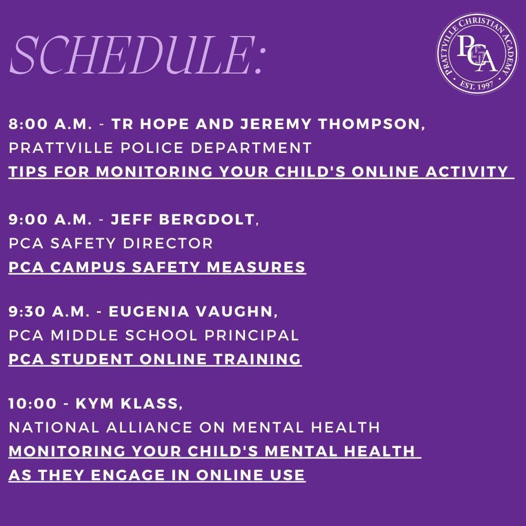 Join us for a safety seminar featuring speakers from the Prattville Police Department, PCA’s Safety Director, PCA’s Middle School Principal and the National Alliance on Mental Health.