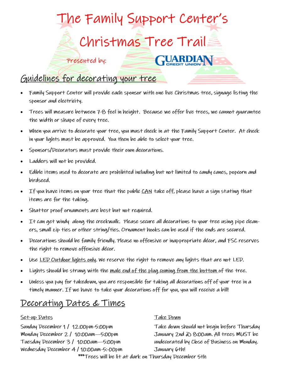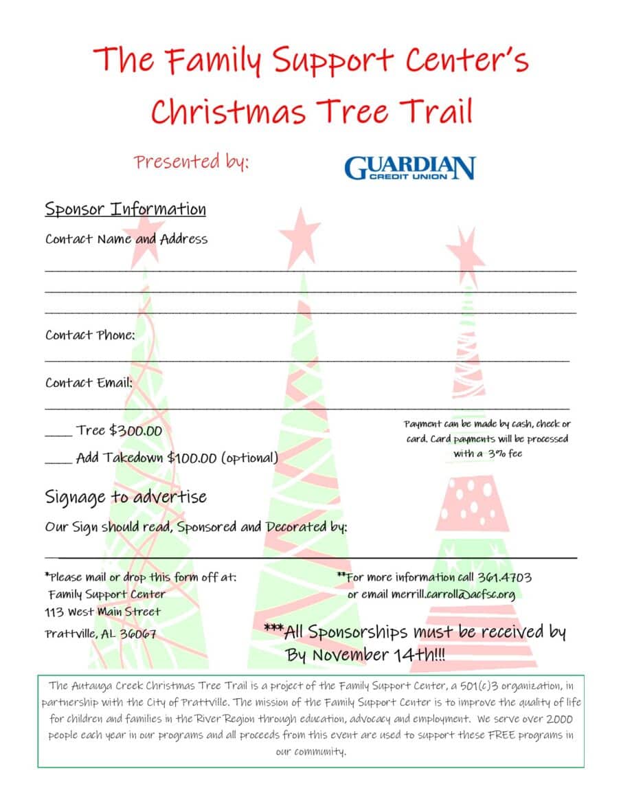 The Family Support Center will be selling Christmas Trees for you to decorate. The trees will be on display the month of December along the Autauga Creek Walk. Guardian Credit Union is a sponsor this year.