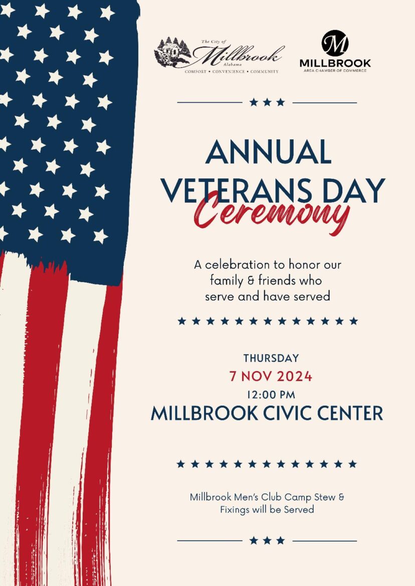 The City of Millbrook invites the public to their annual Veterans Day Ceremony Thursday, Nov. 7, at the Millbrook Civic Center.