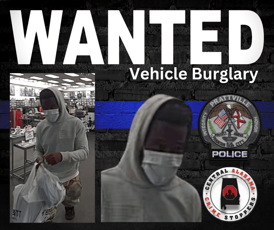 Prattville Police Investigators released photos of an unknown suspect who is wanted for a vehicle burglary and theft investigation. Investigators say the offense occurred on October 8, 2024, in a business parking lot in the 2100 block Cobbs Ford Road, Prattville, AL.