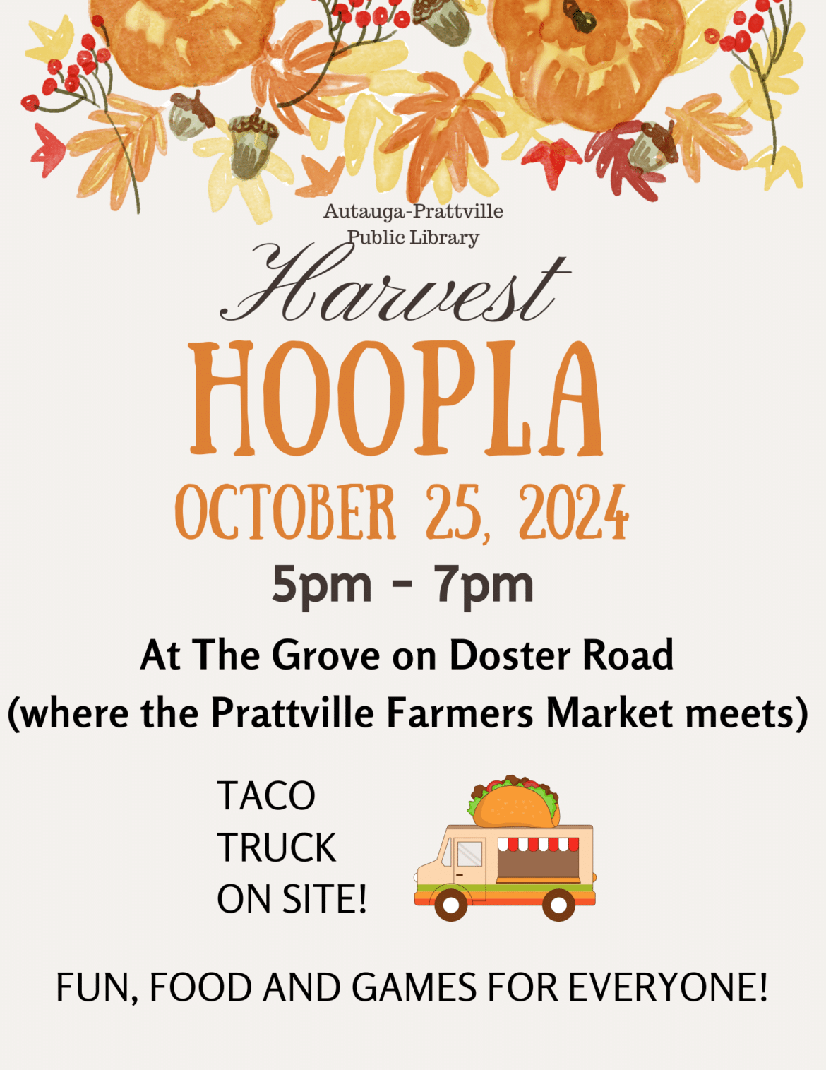 The Autauga-Prattville Public Library is hosting a Harvest Hoopla Friday at The Grove on Doster Road from 5-7 p.m.