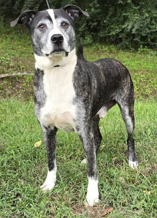 Gunner looks to be 6-8 yrs old, about 45 lbs, and just a wonderfully distinguished fella. He came to us as a stray never reclaimed and is a very friendly and loving boy. Gunner is good with female dogs and seems to prefer adults though no issues with children.
