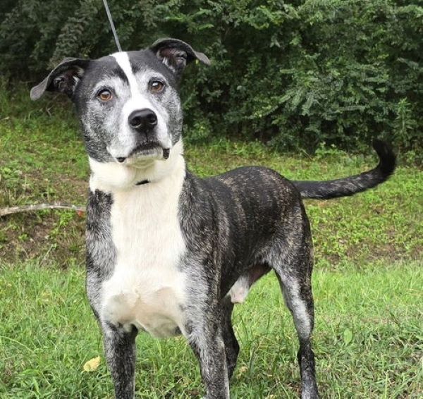 Gunner looks to be 6-8 yrs old, about 45 lbs, and just a wonderfully distinguished fella. He came to us as a stray never reclaimed and is a very friendly and loving boy. Gunner is good with female dogs and seems to prefer adults though no issues with children.