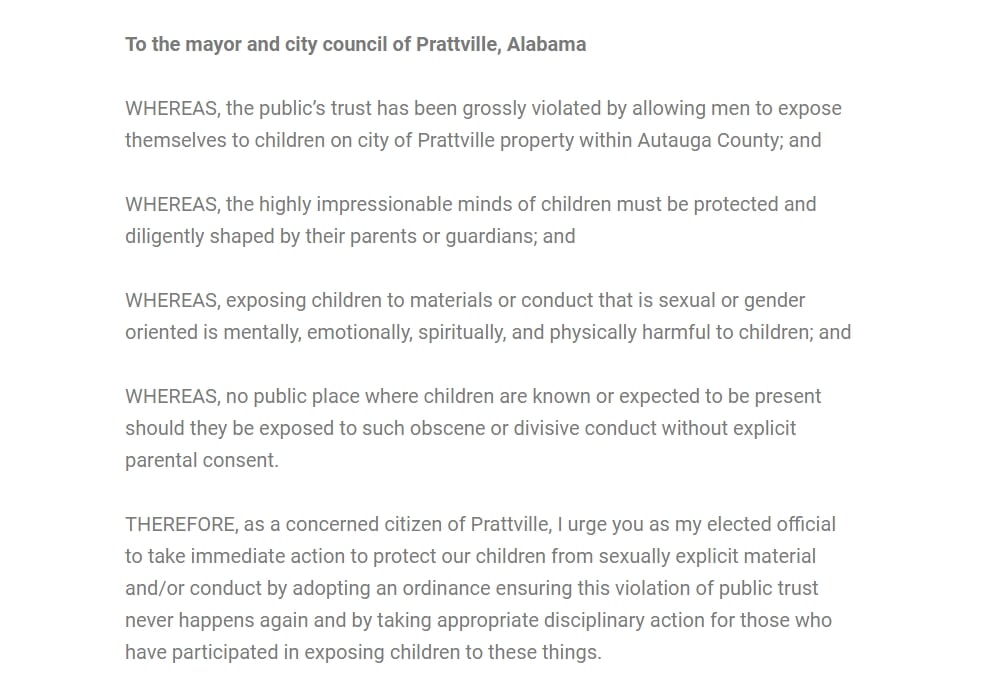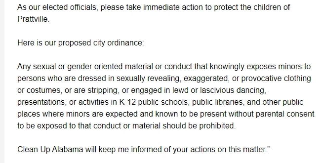 The ordinance written by Clean Up Alabama displayed in the email reads, “Any sexual or gender oriented material or conduct that knowingly exposes minors to persons who are dressed in sexually revealing, exaggerated, or provocative clothing or costumes, or are stripping, or engaged in lewd or lascivious dancing, presentation, or activities in K-12 public schools, public libraries, and other public places where minors are expected and known to be present without parental consent to be exposed to that conduct or material should be prohibited.”