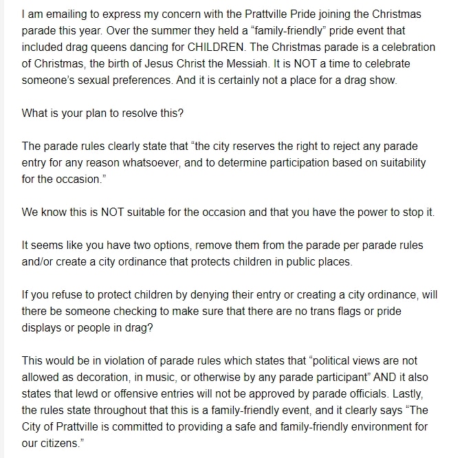 The email stated concerns of Prattville Pride joining the parade celebration where their concerns centered around children’s safety and innocence during the parade, not celebrating the birth of Jesus Christ, trans and pride flags being on display, Prattville Pride being in alleged violation of parade rules, Prattville Pride making the parade not family friendly, and more.