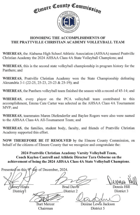 During the Elmore County Commission Meeting on December 9, the Commission approved a Resolution honoring the accomplishments of the Prattville Christian Academy (PCA) Volleyball team, as the 2024 Alabama High School Athletic Association (AHSAA) 4A State Champions.