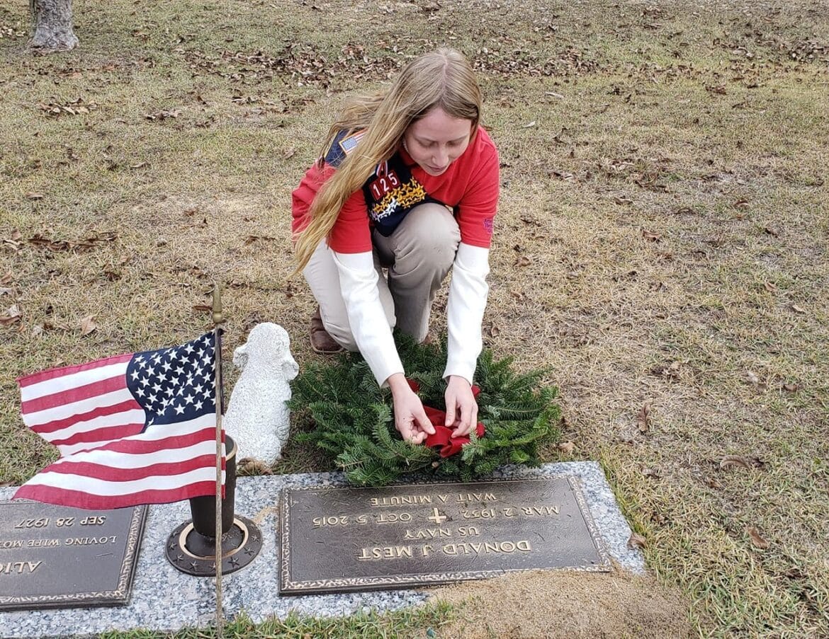 Then the girls, their directors, officials, families and attendees scattered throughout the large cemetery to place wreaths on veterans’ final resting place. Everyone was reminded to speak the veteran’s name as they laid the wreath, to show they are remembered.
