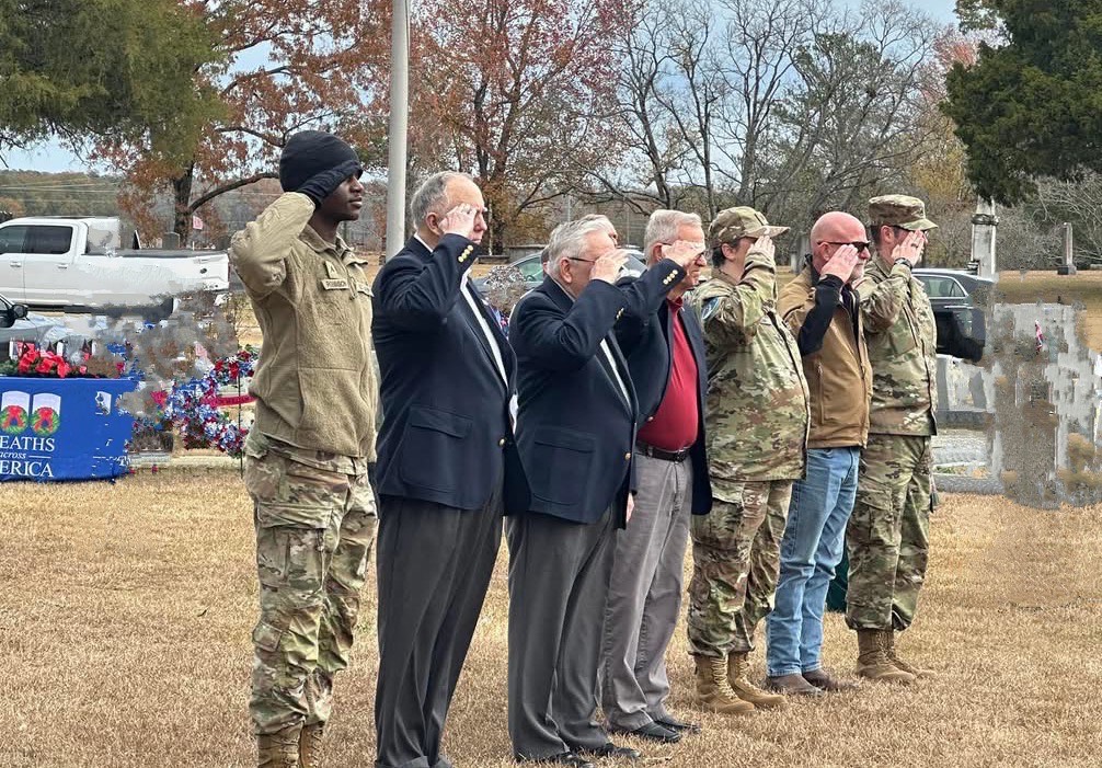 This marks the second year that Sentry Riders Motorcycle Group has partnered with Captain William Bibb DAR to sponsor the event in Wetumpka. Sentry Riders Motorcycle Group leader and event organizer, Paul Wolbeck, gave a touching tribute to our veterans while Captain William Bibb Daughter, Kathleen Tobias, sang the National Anthem. Daughter Alicia Chalker offered the invocation, before a wreath was presented for each branch of service. Representatives were Chief Jerry Hargrave – U.S. Air Force, Ricky Messick – U.S. Marine Corps, Chuck Wiese – U.S. Navy, Major Sallie Duncan – U.S. Space Force, Private Jeremiah Robinson – U.S. Army, Ward Wittington – U.S. Coast Guard, and finally representing the POW/MIA across all branches and divisions of the U.S. Armed Forces, Staff Sergeant Michael Rash – U.S. Army.