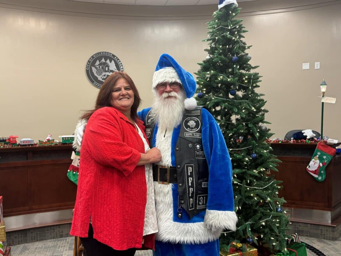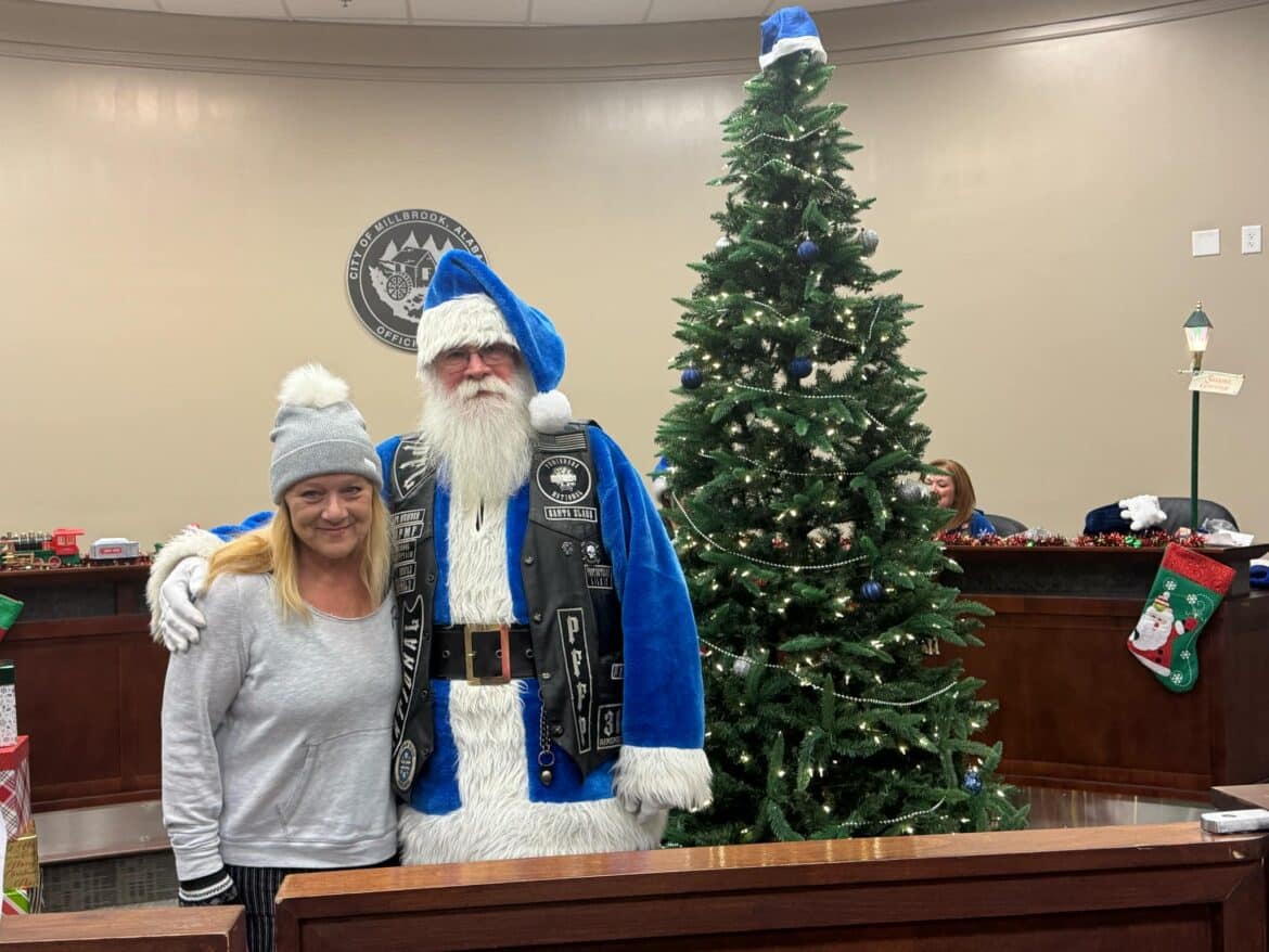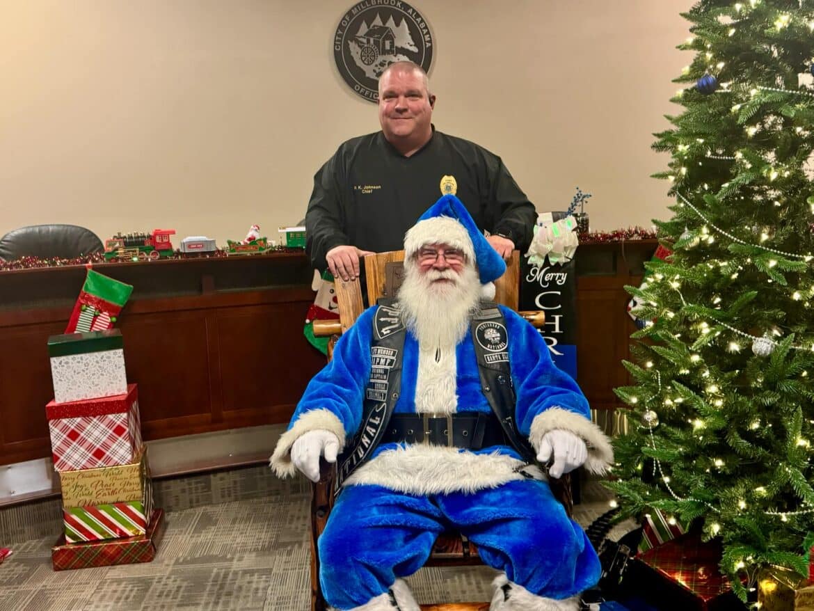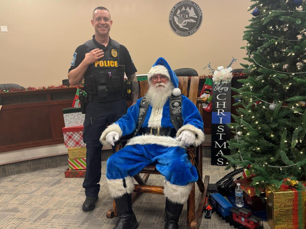 He continued, “As my boss, Mayor Al Kelley, often says, anytime you start thanking people somebody will inevitably get left out. That said, I would like to say Thank You to our partners, who’s hard work and generosity helped make Operation Blue Santa possible this year. Thank you to the Punishers Law Enforcement Motorcycle ClubThree Rivers Chapter, American Legion Post 133, Marty Bean and the Front Porch Grill, Millbrook Presbyterian Church, Robinson Springs Church, Welcome Food Pantry, Pest Pro, Montgomery Harley Davidson, Gina Pellegrino of Millbrook Domino’s Pizza, Vance Law Firm and the wonderful citizens in our community that partnered with us to make this worthwhile campaign a success. Last but certainly not least, I want to say Thank You to Captain Jason Brosius and Mrs. Melissa Stiles, who spearheaded the department’s effort this year and our staff, who worked diligently over the past few weeks in support. Things like this take a lot of planning, time, money and effort. I am extremely proud and appreciative to be associated with so many people that have a servant’s heart. That is one of many things that makes Millbrook very special.