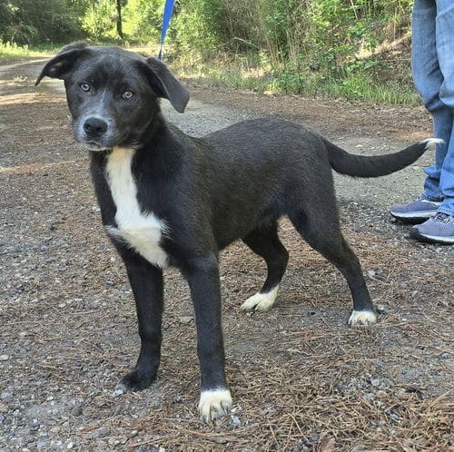 Carlotta is a one-year-old female, only about 35 lbs. She is such a sweet girl, one of a litter found as strays dumped in the woods and still with us. She is great with other dogs, very playful, loves chew toys and will do best with active family/owner. Just want to spend a life with a family all her own.