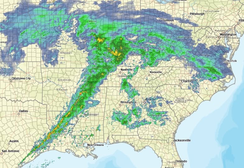 We’ve waves of drizzle and rain showers moving across central Alabama this afternoon. There is a line of heavy rain and thunderstorms to our west, of which will move across our area tonight (image below). The best ingredients for severe storms should remain to our west and we expect this line to be less intense as it moves across central Alabama. Still, it may be able to squeak out a severe storm or two for areas near and west of Interstate 65 between 7 pm and 1 am.