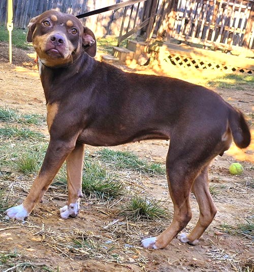 Cinnamon is a ten-month old female Pit looking mix, about 40 lbs. She was found with another dog dumped out on a county road and brought to us. She is a very happy and smiley girl; cuddly, loving and sweet. Great with other dogs & loves going for walks.
