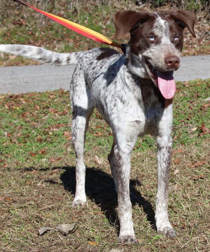 Cupid is a 10-month-old female German Shorthaired Pointer/Husky mix who must be spayed before adoption. She was found out in the county and no owner claimed her. Cupid is a very unusual but beautiful girl. Her short to medium coat is white with chocolate speckles spread throughout it. Cupid has one large chocolate spot on her back, chocolate ears, and beautiful blue eyes! This gorgeous girl weighs 42 pounds so she is considered to be a medium size young dog. The person who brought her is said she was just fine with his dogs; and we believe she will be good with children. Cupid is just a great all-around dog–come meet her soon!