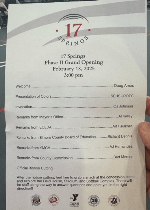 From 17 Springs: “What an exciting day! The grand opening of 17 Springs marks a new era for sports and community events in Elmore County. Phase II includes the stadium, baseball/softball complex, and 80,000 sq ft indoor complex which can host national tournaments and conferences! Huge thanks to the YMCA of Greater Montgomery, City of Millbrook, Elmore County Commission, Elmore County Economic Development, and Elmore County Public Schools for making this vision a reality! Thank you to everyone who showed up today to support this new adventure! Let the games begin! 🥎⚽️🏀⚾️