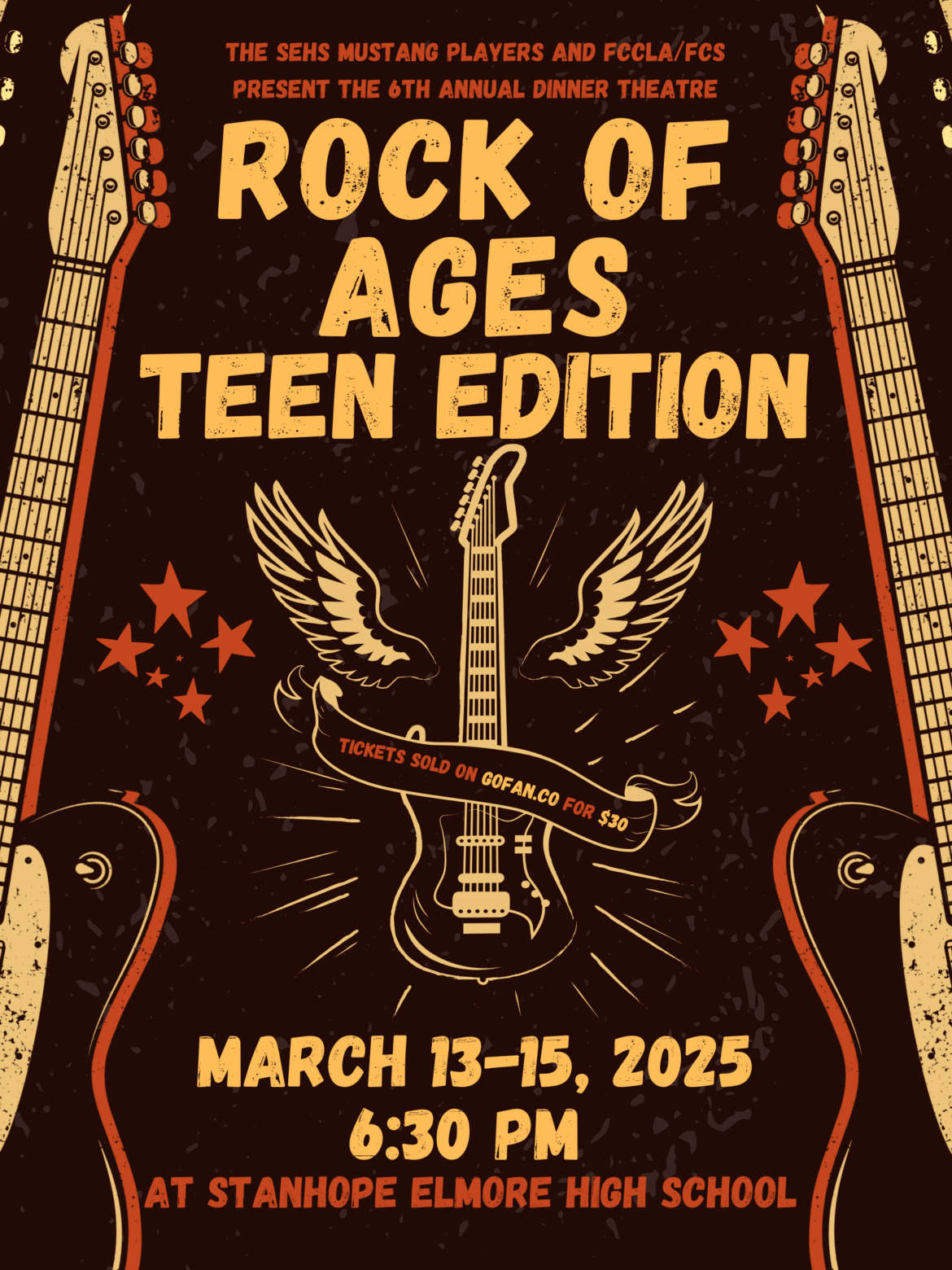 The Stanhope Elmore High Mustang Players and FCCLA/FCS are preparing for a huge production involving over 100 students March 13-15 beginning each night at 6:30 p.m. It is called “Rock of Ages Teen Edition” and will feature some blasts from the past, as well as a three-course dinner. It will be held at Stanhope Elmore High School in the old gymnasium, and tickets are available now at Gofan.co. Once there, search for events for Stanhope Elmore High School and purchase your tickets in advance.