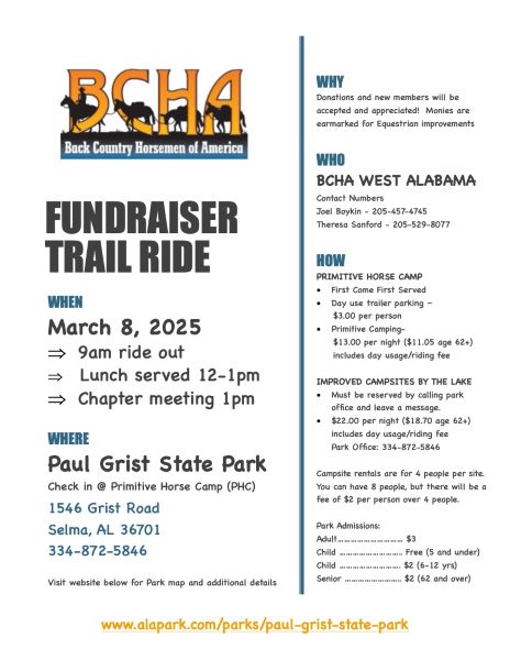 Back Country Horsemen of West, Alabama is hosting a special event for horse owners/enthusiasts on March 8 with a fundraiser trail ride. It will take place at Paul M. Grist State Park in Valley Grande at the primitive horse camp.