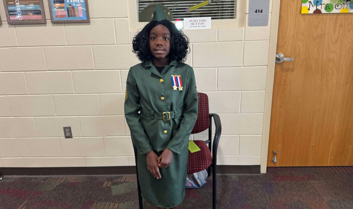 Naomi P., a 4th grade student portrayed Captain Charity Adams, the first African American woman to become an officer of the womenโs armyโs auxiliary corps.