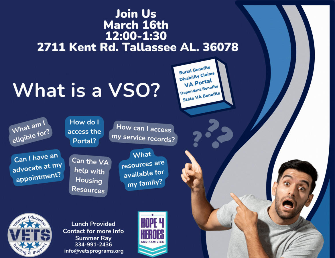 The Veteran Education Training and Support Inc. (VETS) organization in Tallassee has upcoming events including a Lunch and Learn and a Fishing Rodeo.