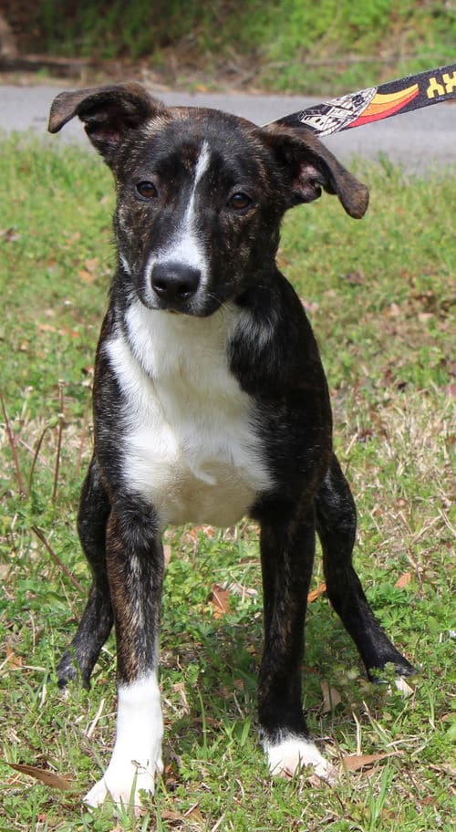 MJ has a short brindle coat with white markings. She has the most adorable underbite that makes her appear to smile at you! This little doll weighs 25 pounds; and we don’t think MJ will get much bigger. MJ is friendly, loving, and would be fine in a home with children. She also gets along well with other dogs. MJ is active and playful and she is very much still a puppy. She would enjoy a fenced yard where she could safely play and zoom around.