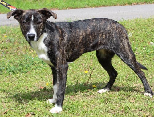 MJ has a short brindle coat with white markings. She has the most adorable underbite that makes her appear to smile at you! This little doll weighs 25 pounds; and we don’t think MJ will get much bigger. MJ is friendly, loving, and would be fine in a home with children. She also gets along well with other dogs. MJ is active and playful and she is very much still a puppy. She would enjoy a fenced yard where she could safely play and zoom around.