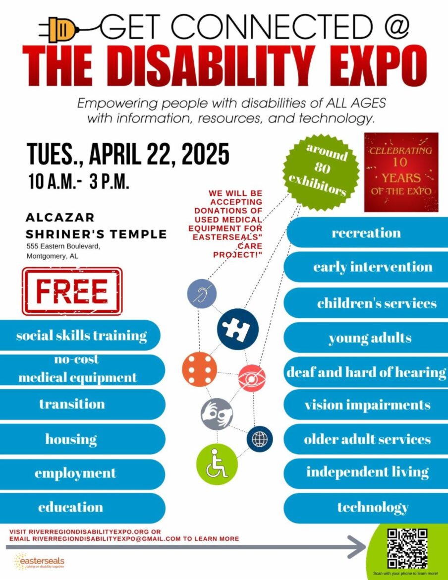 The 10th annual River Region Disability Expo will be held on Tuesday, April 22, 2025, at Alcazar Shriner’s Temple at 555 Eastern Blvd., Montgomery, from 10 a.m. to 3 p.m.