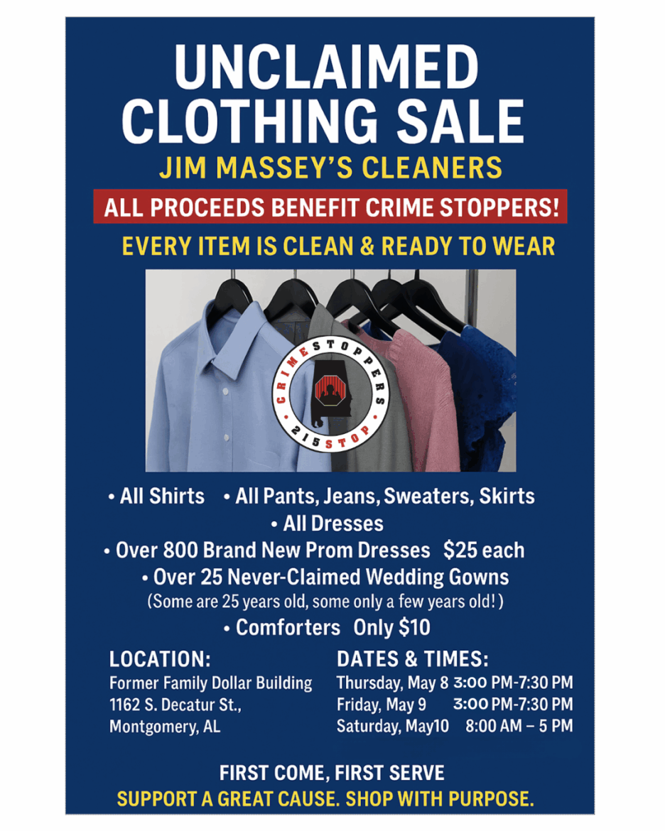 MONTGOMERY, AL — Shop with purpose and support a safer community! Jim Massey’s Cleaners is hosting a one-of-a-kind Unclaimed Clothing Sale, and 100% of proceeds will benefit Central Alabama Crime Stoppers. Every item has been professionally cleaned and is ready for a new home — Help fund vital crime prevention and public safety initiatives through CrimeStoppers.