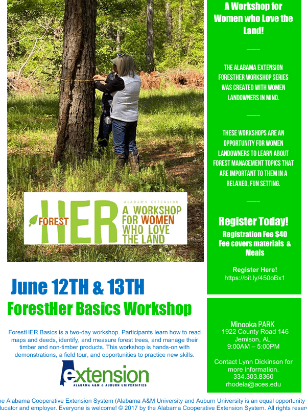 Ladies, do you own land or are you interested in land management?  If so, join the Alabama Cooperative Extension System for a ForestHER Basics workshop on June 12th and 13th at 9 a.m. at Minooka Park in Jemison.