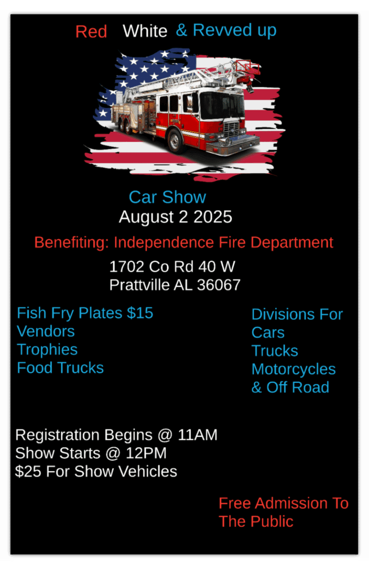 On Saturday, August 2, 2025, we’re hosting our “Red, White & Revved Up” Car Show and Fish Fry at 1702 County Road 40 West in Prattville. This event is both a celebration of community and a crucial fundraiser to support our department’s emergency services.