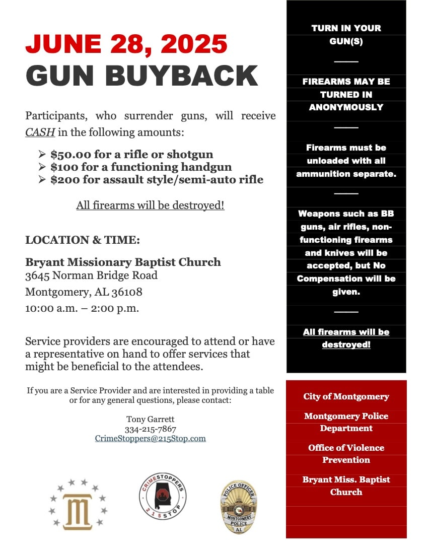 Central Alabama CrimeStoppers is hosting a Gun Buyback event June 28 at Bryant Missionary Baptist Church.