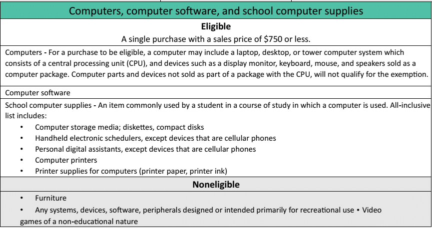 Although the sales tax holiday targets back-to-school shoppers, any consumer can benefit from the savings offered during the weekend. A wide range of items such as diapers, printer ink, flash drives and art supplies are exempt during the holiday, so there is a reason for everyone to shop.