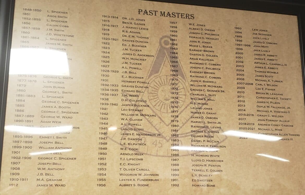 โS. Spigener (WM), J.P. Parham (SW), Amos Smith (JW), and C. Krout (Secretary). These brothers met under a dispensation from The Most Worshipful Grand Lodge of Free and Accepted Masons of Alabama. The dispensation was granted to L. Spigener, Caseman Krout, E. Woodruff, I.C. Richards, Amos Smith, William Carmack, Daniel Pratt, and Jesse P. Parham. The dispensation was signed on December 9, 1847 by R. Greene (Grand Master), Amand P. Pfister (Grand Secretary).โ