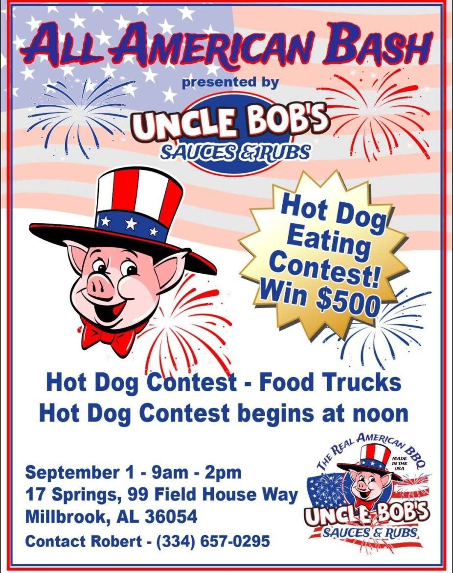 As part of the All American Bash event, there will be food trucks on site as well. The event is Sept. 1, 9 a.m. to 2 p.m. at 17 Springs, located at 99 Field house Way in Millbrook. To contact the organizer, call Robert Harmon at (334) 657-0295.