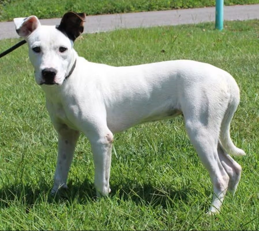 Nillah (formerly known as Snuggles) is an 11–month-old female Terrier mix who must be spayed before adoption. She is a return adoption because her owner was starting school; her original shelter name was Snuggles because she was a precious, snuggly little puppy. Nillah has a solid white coat; and she has a black ear! This girl has beautiful eyes that you really can’t see in her pictures. She weighs 35 pounds so she is a medium sized dog. Nillah is overwhelmed by the sights and sounds at the shelter. She is very timid, shy, and it takes her a moment to warm up to you. Nillah is very calm, well behaved, and walks nicely on a leash. She would be fine with children and other dogs. Nillah is a very nice dog who can’t wait to find a home and a sweet owner.