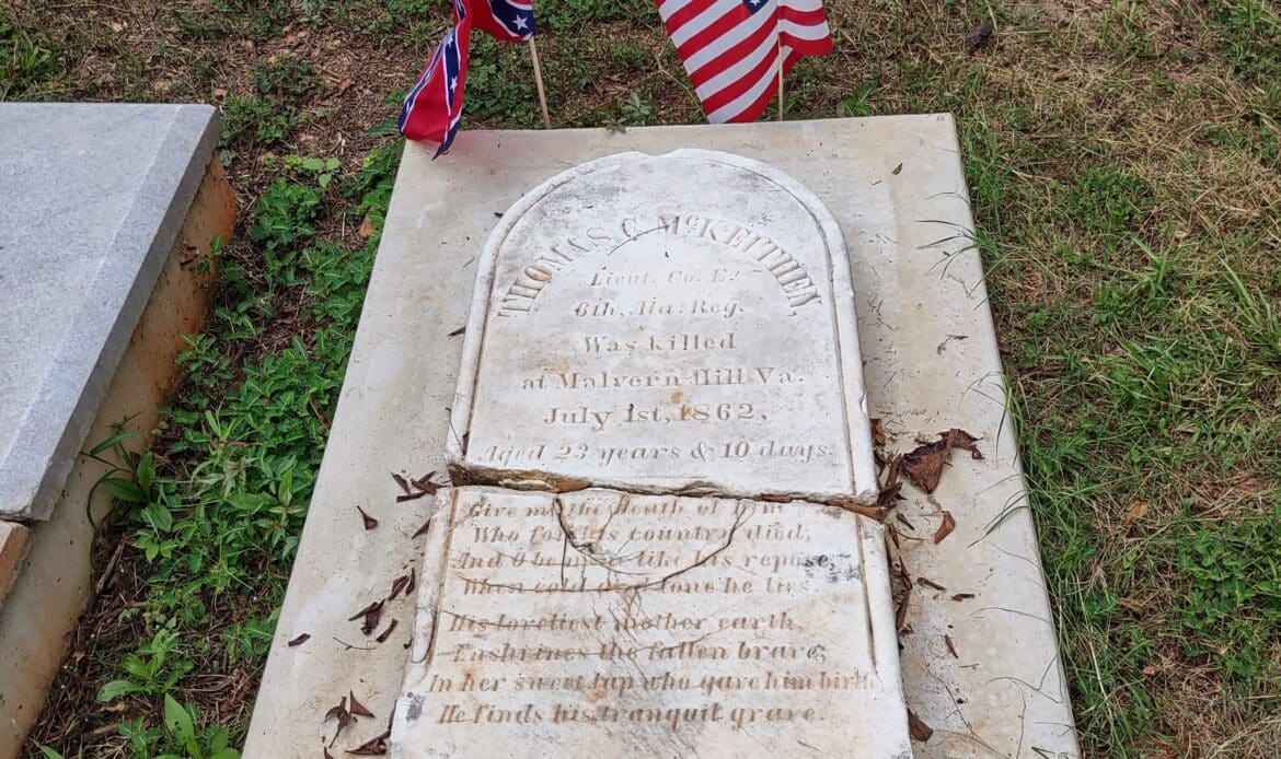 The oldest marked grave in the cemetery is for Alexander’s son, Thomas McKeithen, who was killed in action in 1862, during the Civil War. There may be older graves for infant children of Alexander and his wife, Elizabeth, but it has not yet been confirmed.