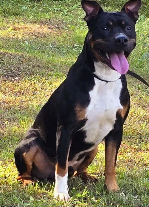 Jigsaw is a two-year old male Pit, 55 lbs – very striking indeed. He is very much the gentleman, likes attention but also happy to just hang out. This big imposing looking boy loves toys, is good with female dogs but no male dogs please.
