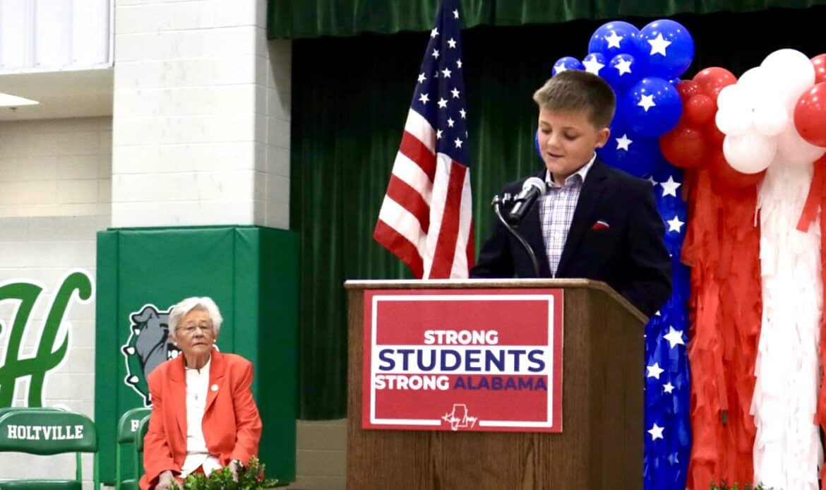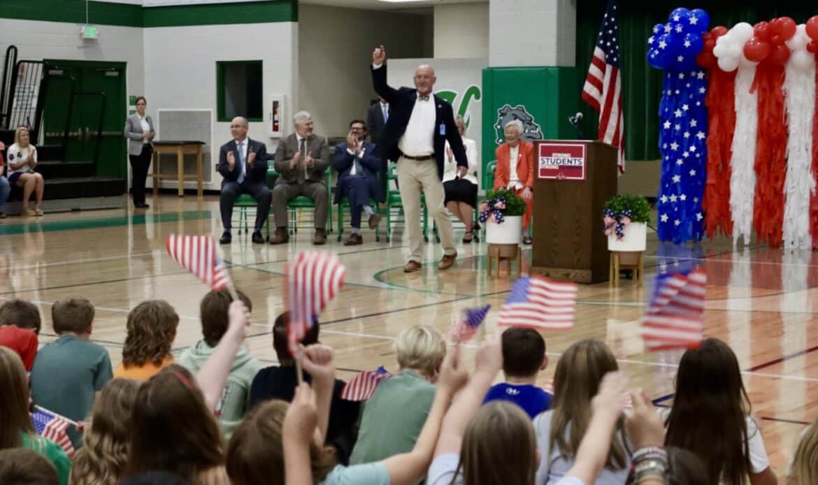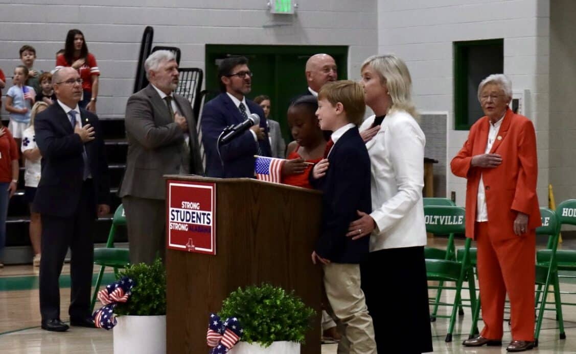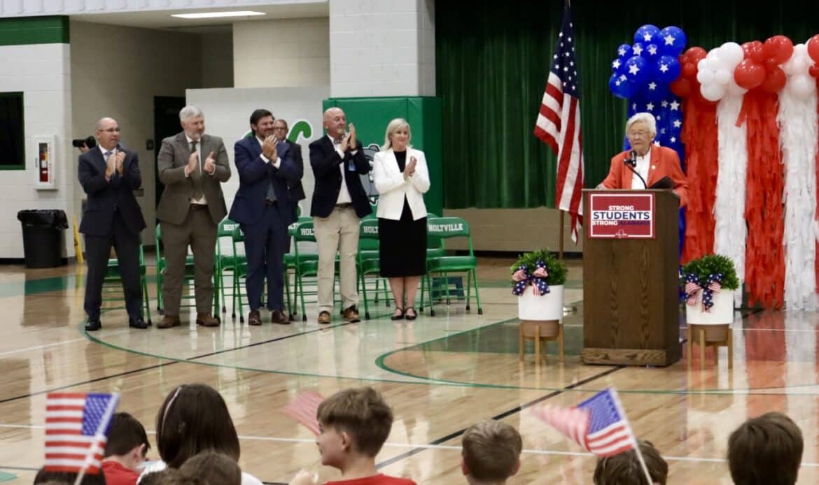 As the governor’s motorcade arrived, the Holtville High School band filled the air with lively music, cheerleaders danced in welcome, and student leaders waved with big smiles. Inside the gymnasium, cheers erupted as Gov. Ivey entered, greeted by a sea of waving flags and little smiling faces.
