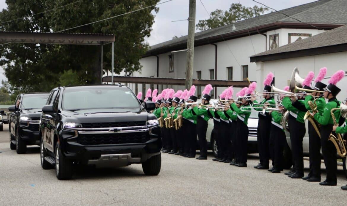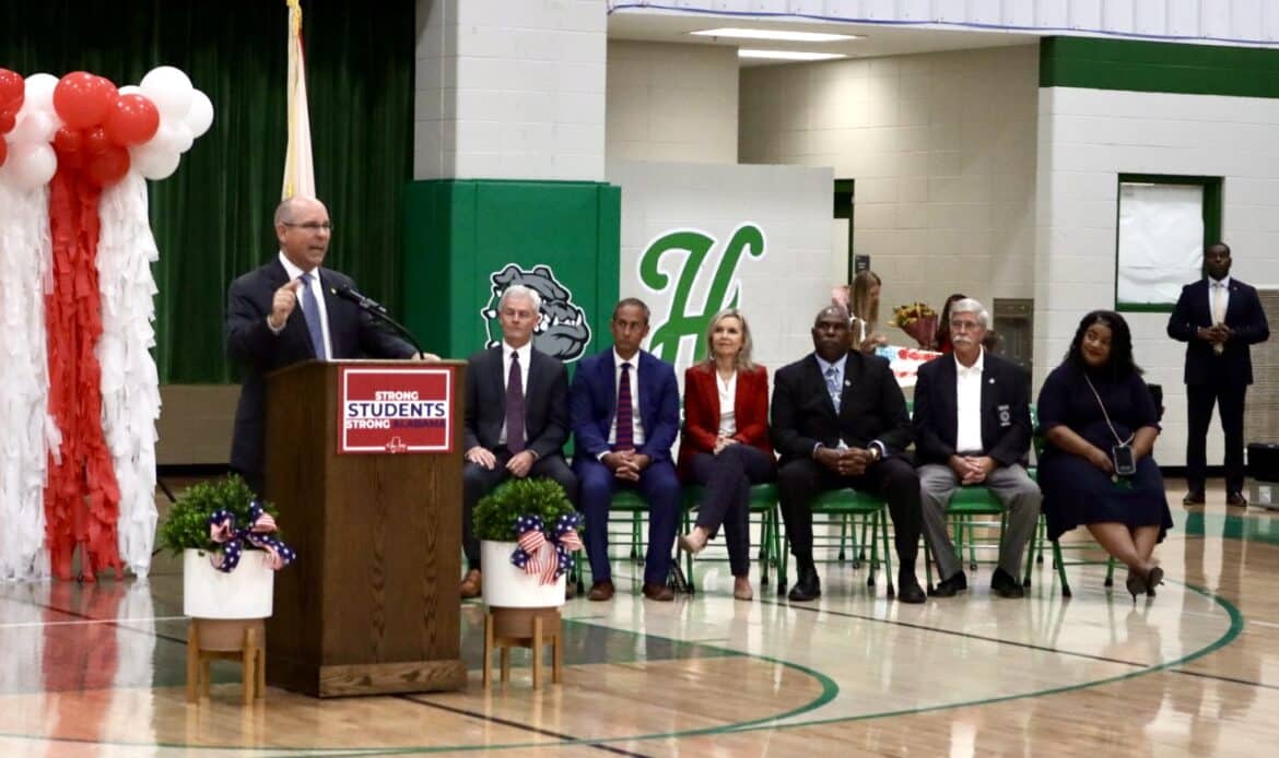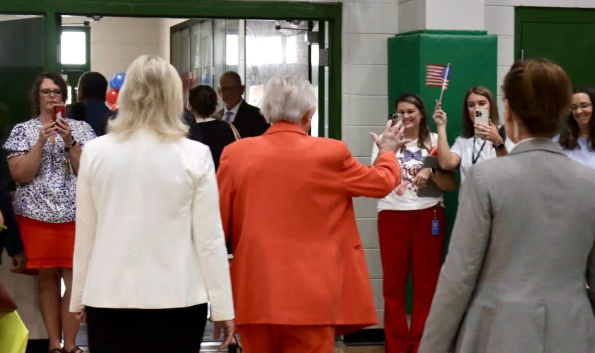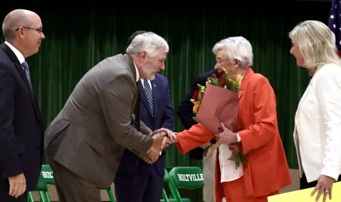 As the governor’s motorcade arrived, the Holtville High School band filled the air with lively music, cheerleaders danced in welcome, and student leaders waved with big smiles. Inside the gymnasium, cheers erupted as Gov. Ivey entered, greeted by a sea of waving flags and little smiling faces.