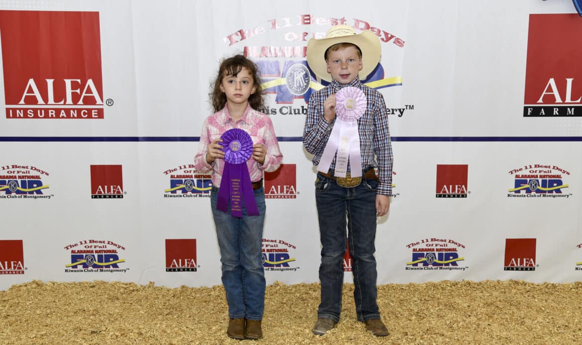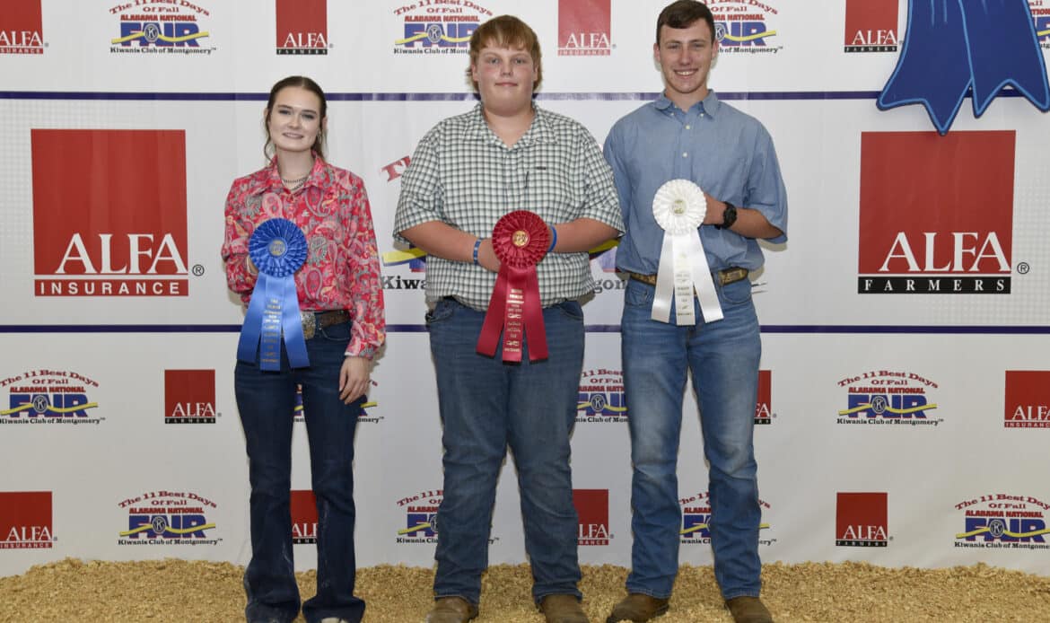 Beginner Premier Exhibitor winners in the Youth Goat Show at the Alabama National Fair Oct. 4 in Montgomery were, from left, Mikayla Horne of Autauga County, first place; and Boone Maples of Chambers County, second place. The Premier Exhibitor competition tests students’ livestock knowledge, evaluation skills and showmanship ability. The beginner division is for students 4-8 years of age. Alabama Farmers Federation and Alfa Insurance sponsored youth livestock activities at the fair.Beginner Showmanship winners in the Youth Goat Show at the Alabama National Fair Oct. 4 in Montgomery were, from left, Boone Maples of Chambers County, first place; and Mikayla Horne of Autauga County, second place. The beginner division is for students 4-8 years of age. Alabama Farmers Federation and Alfa Insurance sponsored youth livestock activities at the fair.Senior Premier Exhibitor winners in the Youth Goat Show at the Alabama National Fair Oct. 4 in Montgomery were, from left, Nathan Brand of Tuscaloosa County, first place; Ella Alldredge of Blount County, second place; and Caleb Hornady of Autauga County, third place. The Premier Exhibitor competition tests students’ livestock knowledge, evaluation skills and showmanship ability. The senior division is for students 16-19 years of age. Alabama Farmers Federation and Alfa Insurance sponsored youth livestock activities at the fair.Senior Showmanship winners in the Youth Goat Show at the Alabama National Fair Oct. 4 in Montgomery were, from left, Ella Alldredge of Blount County, first place; Nathan Brand of Tuscaloosa County, second place; and Caleb Hornady of Autauga County, third place. The senior division is for students 16-19 years of age. Alabama Farmers Federation and Alfa Insurance sponsored youth livestock activities at the fair.