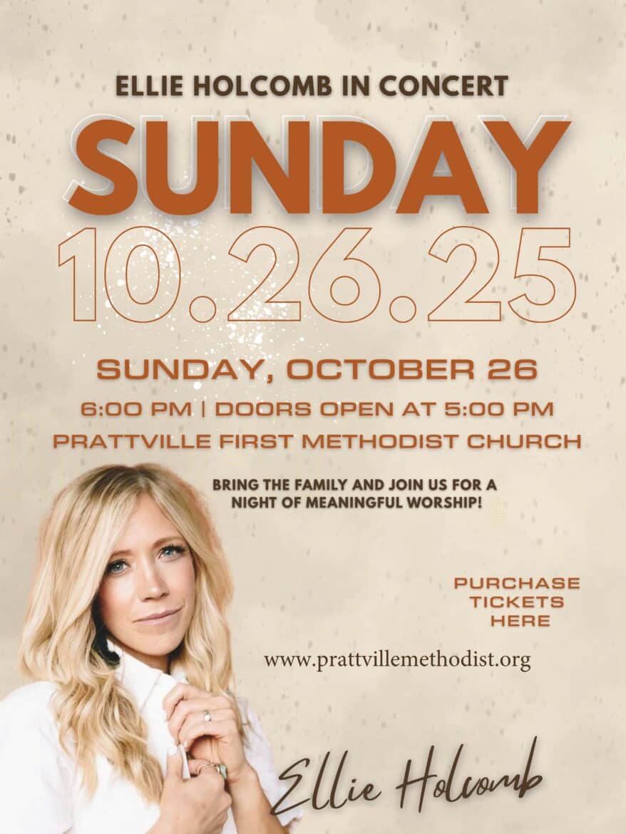 Ellie Holcomb, an award-winning Christian recording artist and children’s book author, will be in concert on Sunday, October 25, at 6:00 pm in the sanctuary of Prattville First Methodist Church.