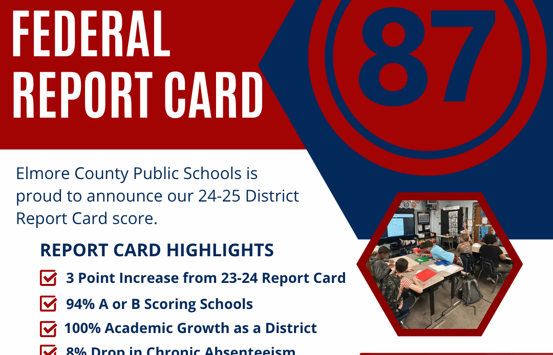 The 2024–2025 state report cards are out, and Autauga County Schools (ACS) and Elmore County Public Schools have big reasons to celebrate! Both districts earned an impressive overall score of 87, their highest since the COVID-19 pandemic and the second highest since the state launched its current accountability system. This year’s results highlight strong, steady momentum across campuses, with scores climbing three points over last year.