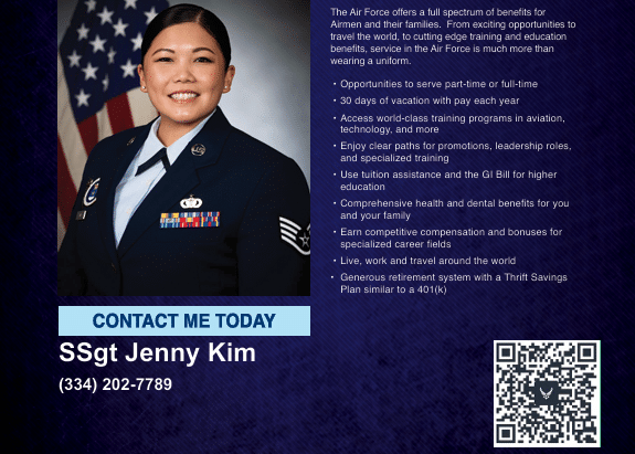 Across the county, she speaks with high school students planning their futures, parents seeking stability for their families, and adults searching for a fresh start. No matter who she meets, she explains the wide range of opportunities the Air Force offers, including: